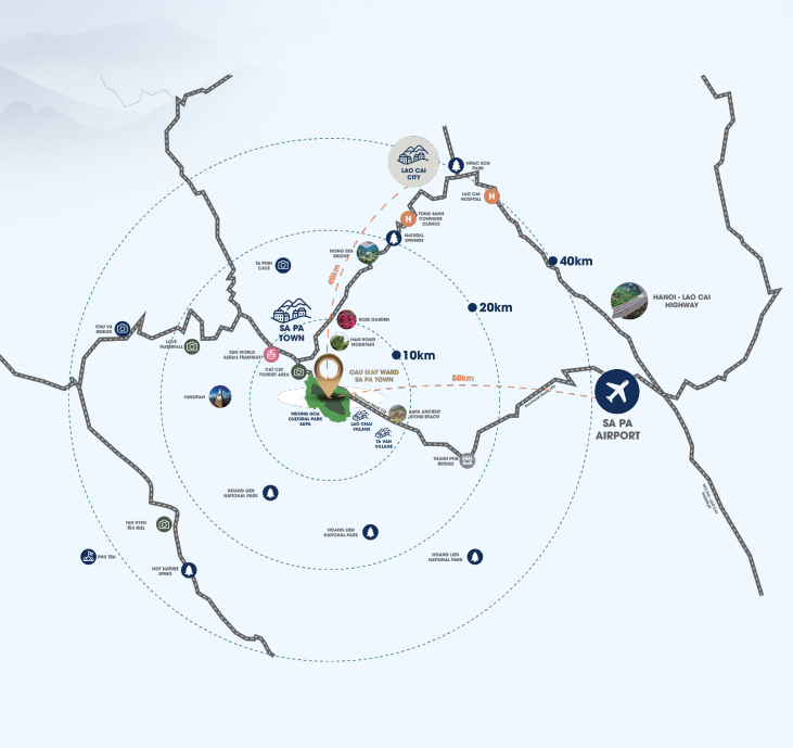 Sở hữu lợi thế về độ cao, khí hậu quanh năm mát mẻ và tầm nhìn bao quát toàn cảnh núi rừng, dự án mang đến không gian sống “giữa tầng mây” – nơi mà thiên nhiên, văn hóa bản địa và trải nghiệm nghỉ dưỡng cao cấp cùng hội tụ. Vị trí chiến lược gần trung tâm thị trấn Sa Pa, dễ dàng kết nối với các điểm đến nổi tiếng như ga cáp treo Fansipan, bản Cát Cát, Tả Van… là yếu tố then chốt giúp gia tăng giá trị khai thác lưu trú và sinh lời bền vững.